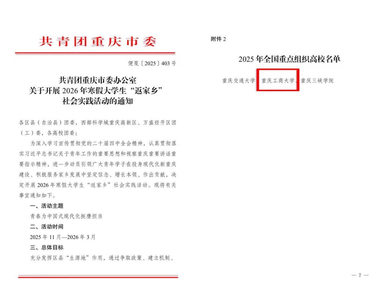 近日,共青团重庆市委办公室下发《关于开展2026年寒假大学生“返家乡”社会实践活动的通知》,对2025年“返家乡”社会实践活动进行表彰,并部署2026年寒假大学生“返家乡”社会实践活动。我校获评2025年“返家乡”社会实践全国重点组织高校,成为重庆市获此殊荣的三所高校之一。一直以来,我校高度重视大学生社会实践育人工作,始终将“返家乡”社会实践作为深化思想政治教育、助力学生成长成才、服务地方发展的重要载体。学校团委牵头构建校地协同平台,紧密对接各区县实际需求,精准匹配实践岗位,每...