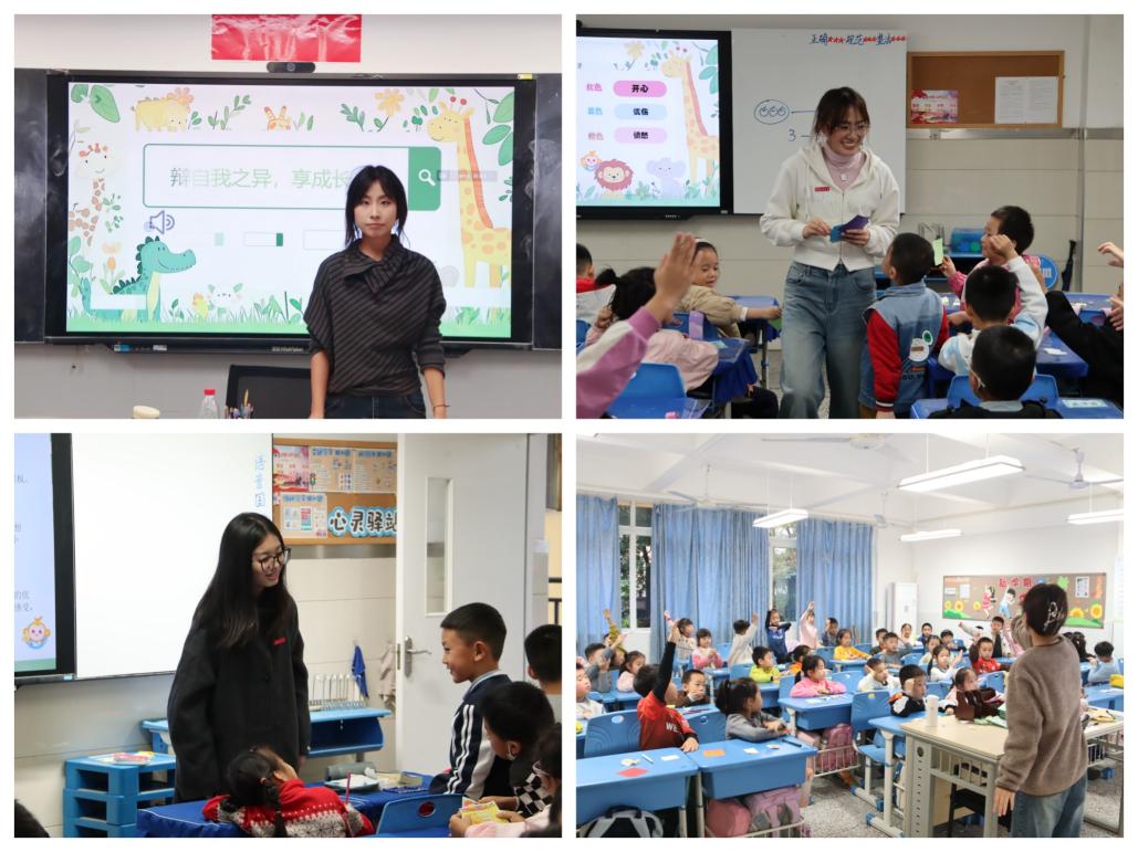 活动中,“风信子”心联社成员面向一年级学生开展“认识自我”主题课程,通过“自我标签‘动物蹲’”“优点大轰炸”“情绪表达”等趣味互动环节,引导同学们在轻松有趣的课堂氛围中认识性格特点、发现自身优点、学习基础的情绪表达方法。课堂上气氛活跃,同学们积极参与,现场充满欢声笑语。