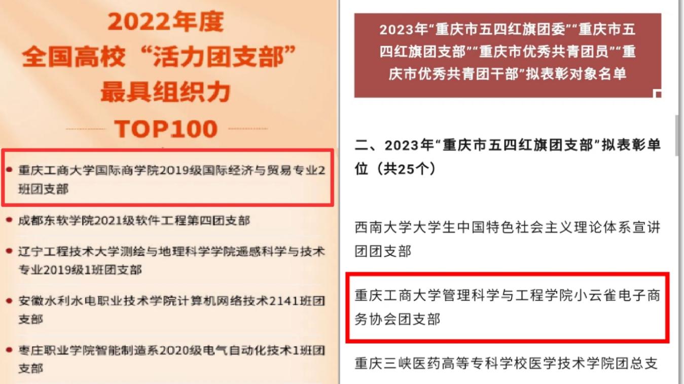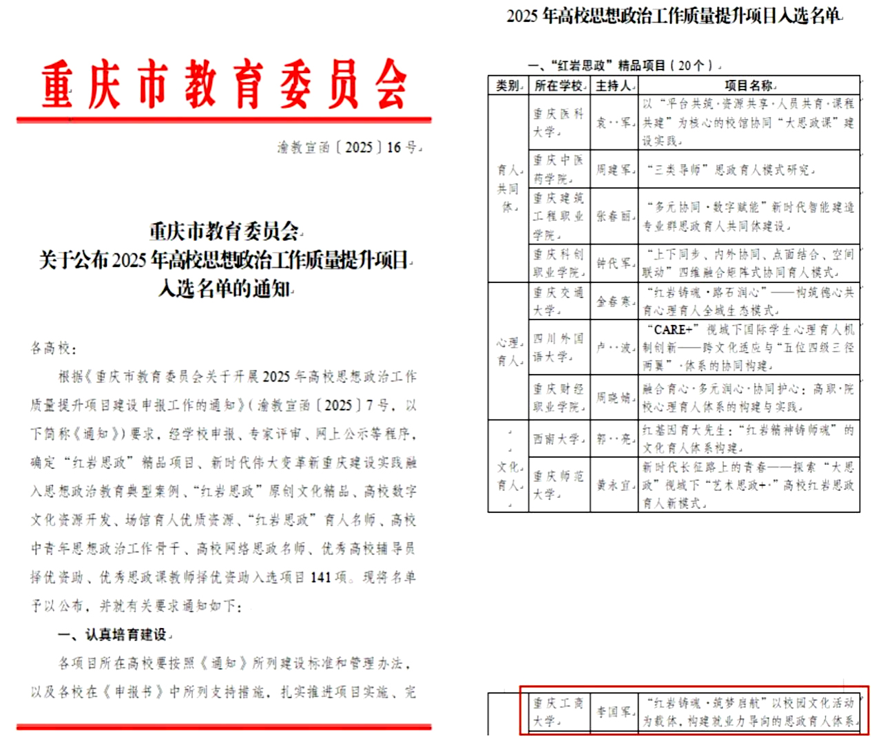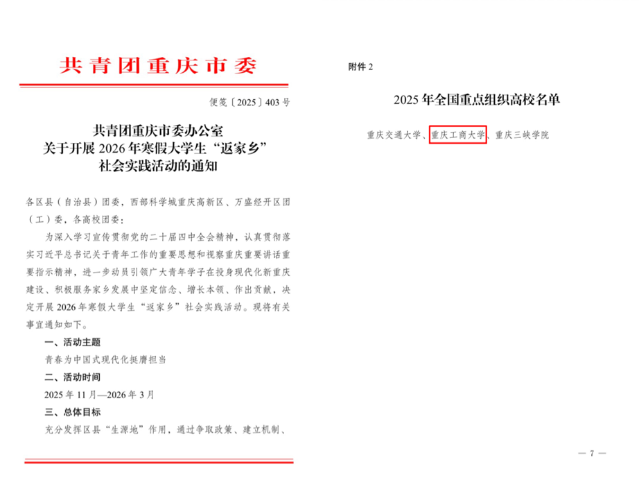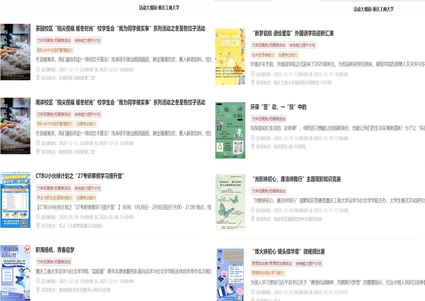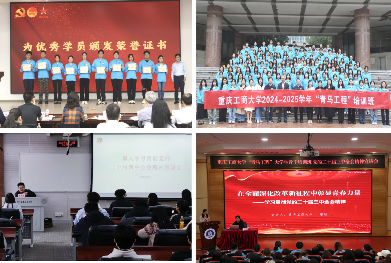 思想政治引领展现新成效。截至2025年12月,我校共有学院分团委19个,班级团支部840个,功能型团支部130个,团员20847名,团青比66.04%。各团支部严格落实“三会两制一课”制度,围绕学习习近平新时代中国特色社会主义思想等开展主题学习实践活动年均1800余场次,不断巩固拓展团员和青年主题教育成果。采取理论授课、专题讲座、红色研学、素质拓展等多种形式,培养校、院青马学员年均1900余人。多形式开展党的二十大、二十届三中全会、四中全会精神宣讲1221场次。聚力构建具有重工商大特色的“青字号”网络新媒体矩阵,刊载宣传稿件2690篇,推送消息2599条,覆盖粉丝数10万余人,校内外“青字号”新媒体矩阵阅览量1100万+;返家乡社会实践短视频专栏在校团委快手账号上浏览量达836万,原创MV《青春告白祖国》播放量达11万+。团学品牌活动受到重庆日报、中青网、新华网、华龙网等主流媒体报道2460次。青马学员参与重庆卫视《思想的力量》节目录制,“理响青年”原创短视频登上学习强国平台。《“红岩铸魂 筑梦启航”:以校园文化活动为载体,构建就业力导向的思政育人体系》入选市教委2025年高校思想政治工作质量提升项目。
