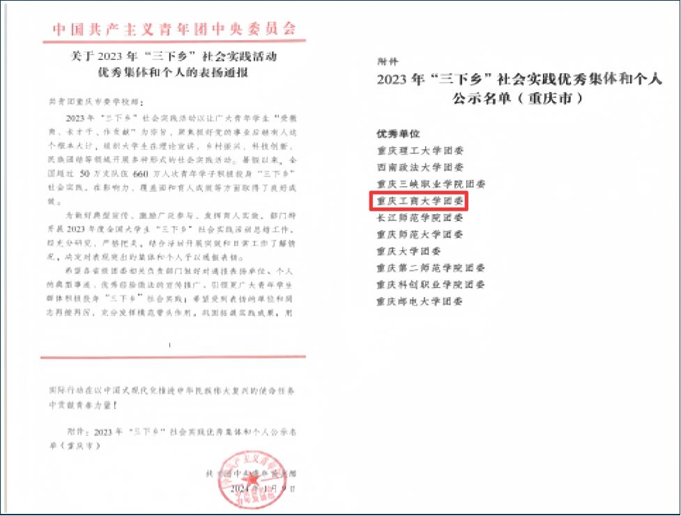 社会实践迈上新台阶。开展“小我融入大我”社会实践育人行动,先后组织15万学生聚焦党史学习教育、爱国主义教育、文化传承、乡村振兴、民族团结、双城经济圈建设、西部陆海新通道建设等主题,深入重庆、新疆、甘肃、四川、贵州等31个省市区开展“三下乡”“返家乡”等社会实践活动。“十四五”期间,共荣获国家级奖励37项,市级奖励70项。218名同学在中国电信、中国移动等企业岗位中体验职场;17914名学生在“扬帆计划”“返家乡”大学生实习实践中增强就业本领。2025年,创新组织505名本研学生、52名专业教师深入川渝27个区县及三峡库区开展“成渝地区双城经济圈城乡融合发展调研”。结合专业特色,为成渝双城专项赋能:采集农户、新型农业主体问卷3000份,构建城乡融合动态数据库,形成深度案例6项、高质量分析报告80余篇;80%参与学生数据分析与政策应用能力显著提升。校团委连续5年获评重庆市“三下乡”社会实践优秀单位,获评2023年全国“三下乡”社会实践优秀单位,2025年全国“返家乡”全国重点组织高校。