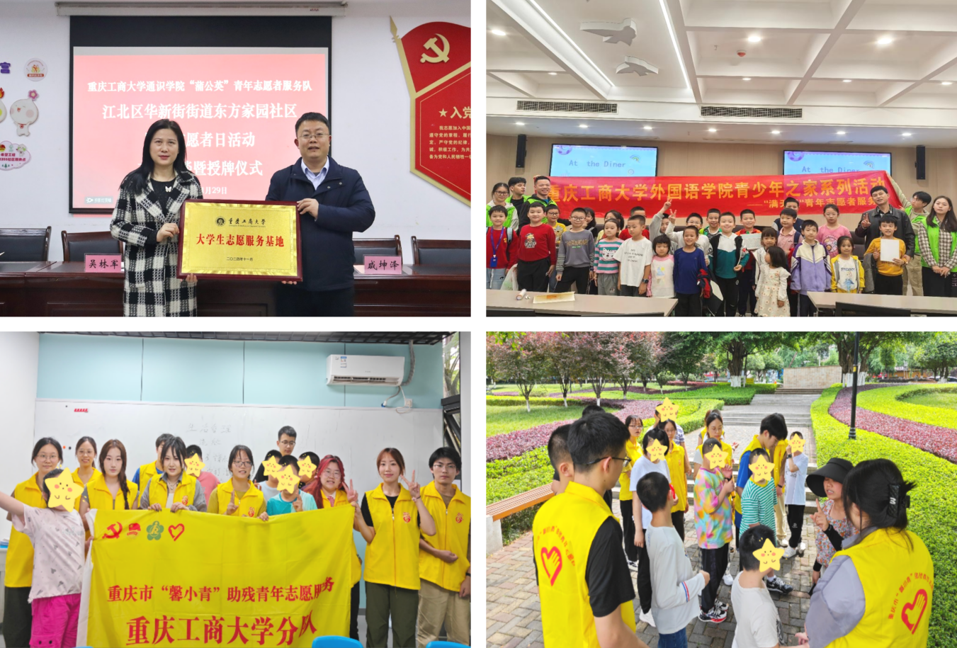 志愿服务展现新风貌。深化志愿服务育人功能,构建特色志愿服务体系,打造“翠小青”志愿服务文化品牌,组建“青翠100”骨干志愿者队伍。截至2025年12月,全校注册志愿者30824人(占比97%),20个青年志愿者服务队服务于15个助残基地、30个社区青少年之家、19个敬老院、27个其他类志愿服务基地,年均开展志愿服务760余场次,参与志愿者22000余人次,人均服务时长20.4小时。连续四年加入重庆市“馨小青”阳光助残行动,年均开展助残活动200余场次,参与志愿者2500余人次,服务残疾人4800余人次。积极服务2025年央视春晚重庆分会场、第31届世界大学生运动会、智博会、西洽会、中新金融峰会、“一带一路”科技交流大会、第十四届全国冬季运动会、重庆马拉松等大型赛会共计38场次。“十四五”期间,选派645名西部计划志愿者赴西藏、新疆、云南、贵州、重庆等地服务,人数位列市属高校前列。形成以“小红帽”“小云雀”“馨小青”“小红馨”“匠小青”“文小闻”“艺美乡村”为代表的《“一院一品牌”行走的思政课》志愿服务品牌项目,荣获中国志愿服务项目大赛全国铜奖2项。校青年志愿者协会获评2021年第十三届中国青年志愿者优秀组织奖。