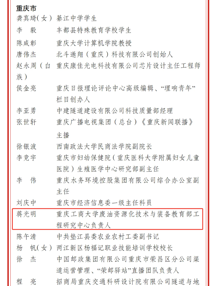 4月27日,共青团中央、全国青联发布了《关于颁授2026年度中国青年五四奖章暨新时代青年先锋奖的决定》,我校废油资源化技术与装备教育部工程研究中心负责人蒋光明教授荣获“2026年度新时代青年先锋”称号。这一荣誉,生动诠释了我校青年科技工作者勇担使命、以实干笃行服务国家战略的先锋本色。