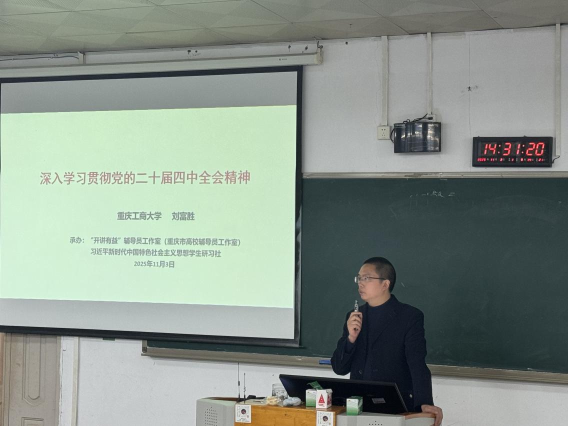 11月3日下午,“开讲有益”重庆市高校辅导员工作室与习近平新时代中国特色社会主义思想学生研习社于慧智楼90209教室联合举办党的二十届四中全会精神宣讲会。本次宣讲会特邀马克思主义学院院长刘富胜主讲,由习近平新时代中国特色社会主义思想学生研习社指导教师龙睿赟主持。