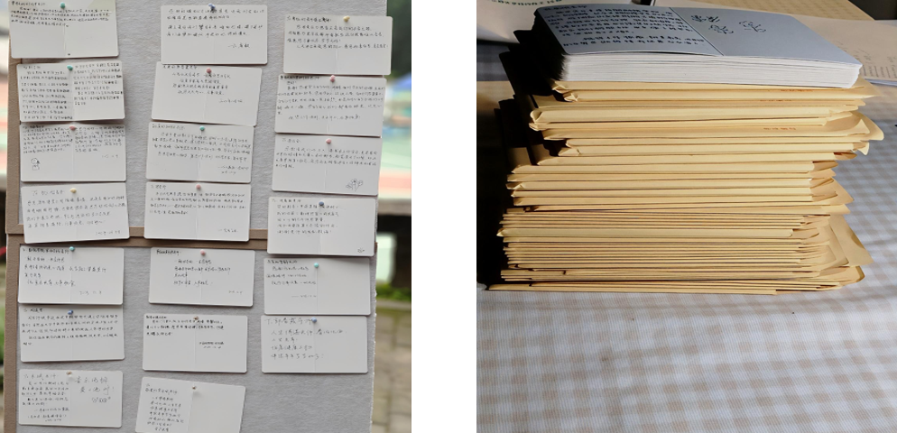 活动初期,志愿者们在南三宿舍前设立感恩卡片领取点,供同学们书写对老师的敬意与祝福,投入收集盒并登记信息。随后,志愿者在启智楼布置“师恩似海”展示墙,集中呈现部分感恩卡片,吸引众多师生驻足观看、拍照留念,满墙的手写祝福让校园洋溢着感恩氛围。活动后期,志愿者们将卡片分类整理,逐一送至教师办公室,许多老师表示:“这是最温暖的礼物”。数学与统计学院“数小析”青年志愿者服务队的宣传小组用镜头记录下温馨瞬间,并制作成纪实短片,进一步传递师生温情。