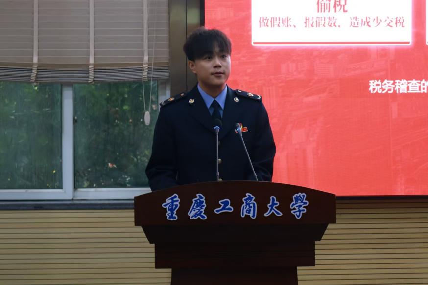 为了增强税收法治意识,向同学们普及税法知识,12月4日下午,“税月筑梦,与宪同行”税收宣传主题讲座于兰花湖报告厅顺利举行。本次活动由会计学院、重庆市税务局第五稽查局、重庆经济技术开发区税务局联合主办,由经开区税务局曹蓝予和第五稽查局姚郅言担任主讲。会计学院2025级200余名学生参加。讲座由会计学院2025级CIMA班杨宏博主持。