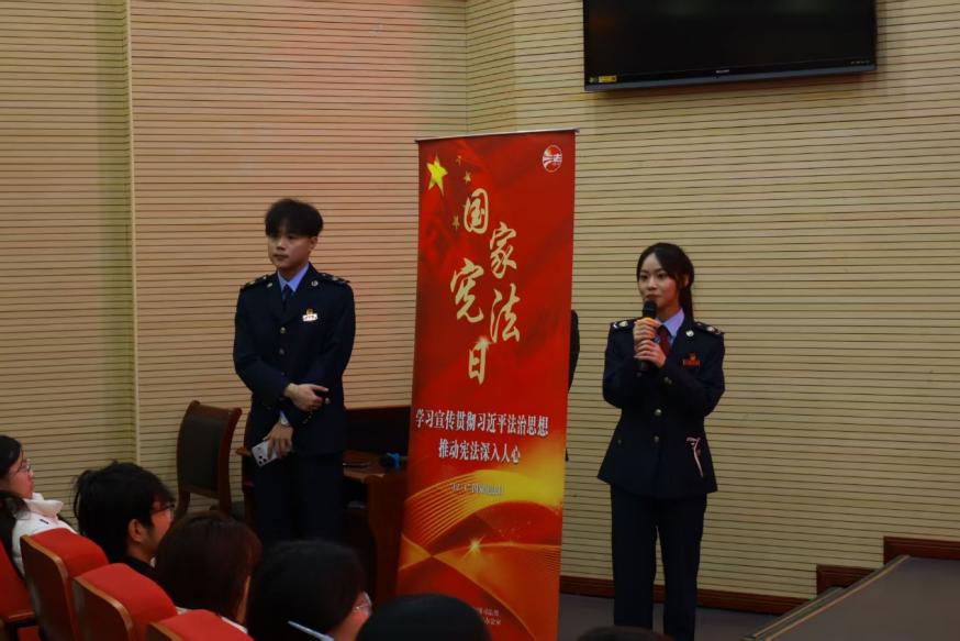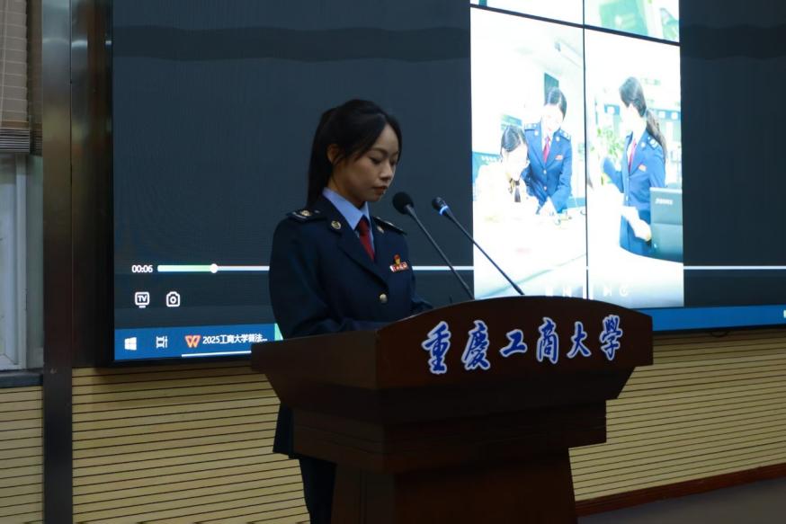 随后,重庆市税务局第五稽查局的姚郅言先为同学们讲解了宪法中的税收相关内容,紧接着通过“11.18案件”进行了个人信息保护与求职防骗法律知识讲解,呼吁同学们在假期兼职或实习时保护个人信息,入职前通过天眼查或相关企业信息网站核查企业是否正规,再投递简历。同时也要注意防人之心不可无,不要相信天上掉馅饼。