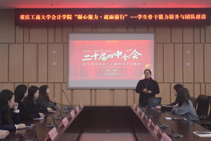活动伊始,郝颖面向会计学院全体学生骨干进行专题宣讲。她围绕党的二十届四中全会精神展开解读,紧扣高质量发展与新质生产力的核心要义,结合“五育并举”育人导向,系统阐释了二十届四中全会精神对高校学生工作提出的实践要求,为学生骨干开展工作筑牢思想根基。