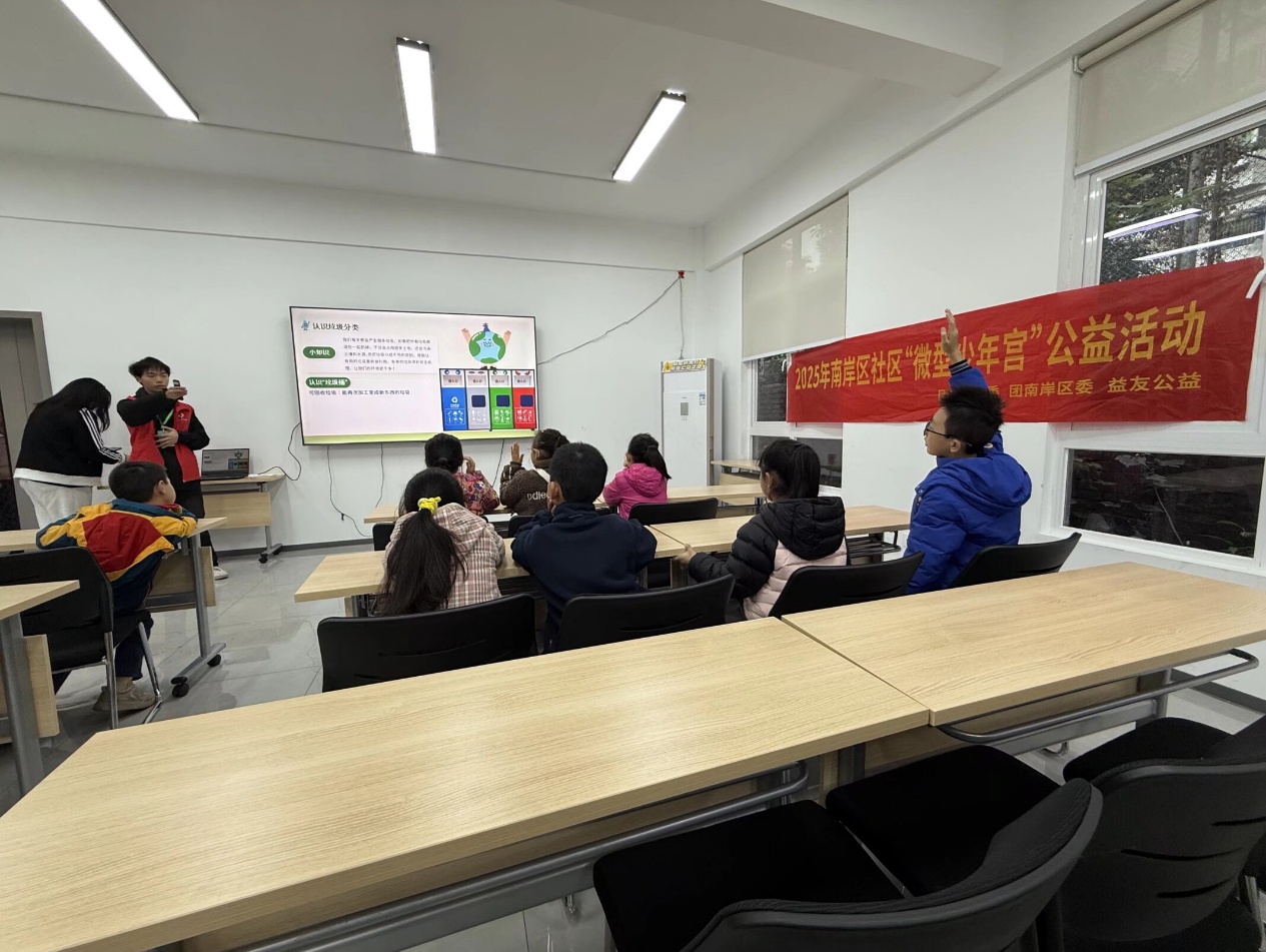 活动当天,志愿者们统一乘车抵达社区服务中心,迅速投入前期准备。大家分工协作,高效完成场地布置与物料整理。随后,通过趣味讲解结合PPT演示,志愿者向孩子们普及了垃圾分类、资源回收等环保知识,用生动易懂的语言解答疑问,让环保理念深入童心。实践环节中,志愿者带领孩子们走进社区收集落叶,将这些自然“废弃物”转化为手工素材,在实践中深化绿色理念。