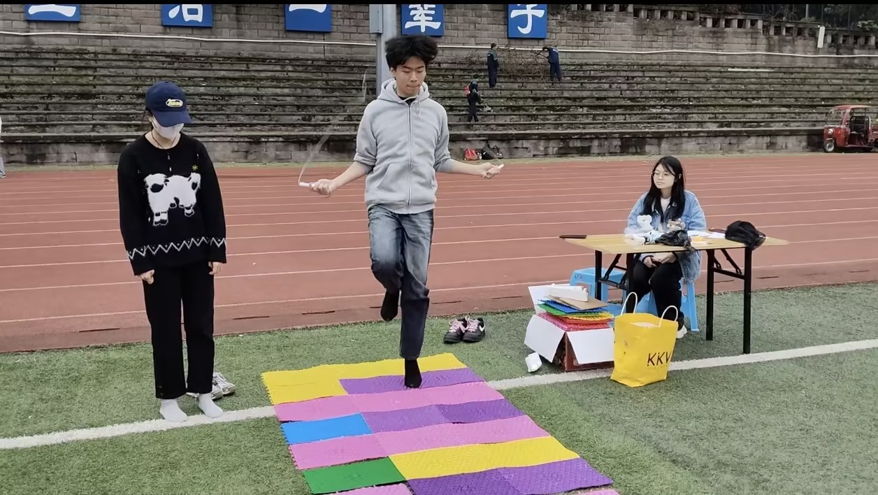 赛场上,同学们以饱满的热情投入各项比拼,展现青春活力与团队协作。“白泽智行”九宫夺魁赛中,选手以颜色方块为棋,在九宫格间往返布局,精准传接,每一次落位都体现团队默契。“青龙摆尾”默契运球赛中,队员手夹气球连成一列,完成S形绕杆,气球掉落时迅速重整队形,体现团队凝聚力。“朱雀振翅”指压板全能赛中,跳绳、赛跑、运乒乓球、猜歌四个环节接连挑战,选手在指压板上奋勇争先。“玄武稳守”旋风同行赛中,六名队员紧握长杆同步奔跑,保持队形、协同发力,步伐整齐。“麒麟踏云”同心鼓颠球赛中,队员手拉长绳,用鼓面连续颠起排球,在两分钟内比拼颠球次数。“饕餮聚能”眉语传食赛中,选手用面部表情移动额头饼干,全程手不触碰,展现应变能力。