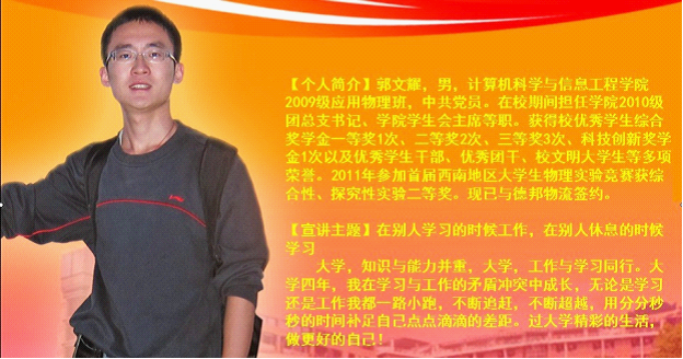 大家晚上好!我是计算机科学与信息工程学院2009级应用物理专业的郭文耀。很荣幸参加我校2013届优秀毕业生宣讲会。