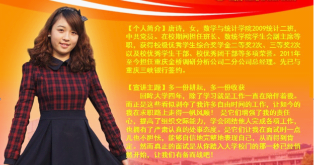 现在我正处在毕业之际,也就是走上了求职之路。凭借着多年的学生工作经验,我的求职之路走得还算平坦, 例如在面试的时候,我一点儿也不胆怯,能够自信地完整地表现自己,这让我在寻找工作的征程中获得了较好的成绩。谈到自信与表达能力,它不是在一天两天内就能够建立起来,或是有什么速成班可以学习的。真正的面试从你踏入大学校门的那一秒,已经悄然开始!所以希望大家在学习之余也要丰富自己的工作经历。不要怕吃苦,不要怕耽误自己玩耍的时间,你要相信,若是付出了肯定会有回报。这就是真理“一份耕耘,一份收获”。就拿我来说,我最终在优衣库,德邦物流,龙湖物业,恒丰银行,农村商业银行,重庆三峡银行等单位中综合考虑选择了重庆三峡银行作为自己的就业单位。